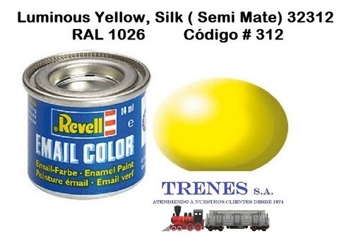 LUMINOUS YELLOW, SILK ( AMARILLO LUMINOSO, SEMI-MATE ) 32312RAL 1026!!!!!!! SEMI-MATE O SEMI-BRILLANTE ES LO MISMO!!!!!!!!La pintura REVELL está hecha con resinas sintéticas que no dañan la superficie plástica de tu modelo!Se puede aplicar en otros materiales como metal, cerámica, madera, acrílicos, resina etc.Con excepción de los colores transparentes, se pueden mezclar entre si .Se puede aplicar con pincel o aerógrafo para mejor acabado en aerografía se recomienda diluir con “REVELL COLOR MIX”Es posible aplicar otro color u otra capa de pintura en el lapso de 4-6 horas.La pintura seca completamente en 24 horas. PINTURA HECHA EN ALEMANIA