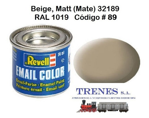 BEIGE, MATT (BEIGE, MATE ) 32189 RAL 1019 La pintura REVELL está hecha con resinas sintéticas que no dañan la superficie plástica de tu modelo!Se puede aplicar en otros materiales como metal, cerámica, madera, acrílicos, resina etc.Con excepción de los colores transparentes, se pueden mezclar entre si .Se puede aplicar con pincel o aerógrafo para mejor acabado en aerografía se recomienda diluir con “REVELL COLOR MIX”Es posible aplicar otro color u otra capa de pintura en el lapso de 4-6 horas.La pintura seca completamente en 24 horas. PINTURA HECHA EN ALEMANIA