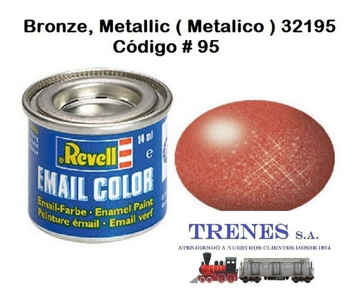 BRONZE, METALLIC ( BRONCE ROJIZO, METALICO ) 32195La pintura REVELL está hecha con resinas sintéticas que no dañan la superficie plástica de tu modelo!Se puede aplicar en otros materiales como metal, cerámica, madera, acrílicos, resina etc.Con excepción de los colores transparentes, se pueden mezclar entre si .Se puede aplicar con pincel o aerógrafo para mejor acabado en aerografía se recomienda diluir con “REVELL COLOR MIX”Es posible aplicar otro color u otra capa de pintura en el lapso de 4-6 horas.La pintura seca completamente en 24 horas. PINTURA HECHA EN ALEMANIA