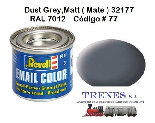 DUST GREY , MATT ( GRIS POLVO , MATE) 32177RAL 7012 La pintura REVELL está hecha con resinas sintéticas que no dañan la superficie plástica de tu modelo!Se puede aplicar en otros materiales como metal, cerámica, madera, acrílicos, resina etc.Con excepción de los colores transparentes, se pueden mezclar entre si .Se puede aplicar con pincel o aerógrafo para mejor acabado en aerografía se recomienda diluir con “REVELL COLOR MIX”Es posible aplicar otro color u otra capa de pintura en el lapso de 4-6 horas.La pintura seca completamente en 24 horas. PINTURA HECHA EN ALEMANIA