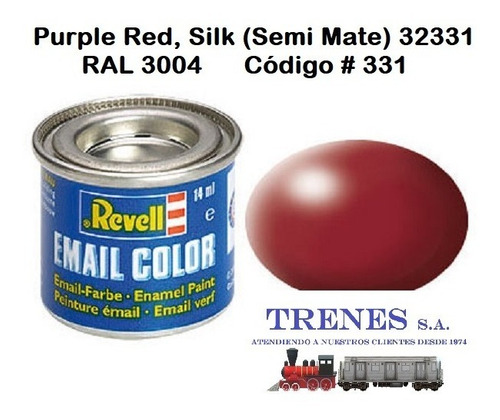 PURPLE RED, SILK ( ROJO PURPURA, SEMI-MATE ) 32331RAL 3004!!!!!!! SEMI-MATE O SEMI-BRILLANTE ES LO MISMO!!!!!!!!La pintura REVELL está hecha con resinas sintéticas que no dañan la superficie plástica de tu modelo!Se puede aplicar en otros materiales como metal, cerámica, madera, acrílicos, resina etc.Con excepción de los colores transparentes, se pueden mezclar entre si .Se puede aplicar con pincel o aerógrafo para mejor acabado en aerografía se recomienda diluir con “REVELL COLOR MIX”Es posible aplicar otro color u otra capa de pintura en el lapso de 4-6 horas.La pintura seca completamente en 24 horas. PINTURA HECHA EN ALEMANIA