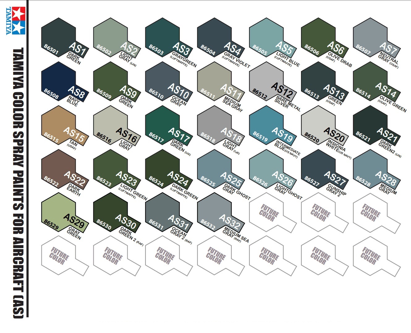 La serie AS de Tamiya, son colores exactos para dar tono a modelos de aviones militares principalmente de Estados Unidos (USAAF) , Japón (IJN =IMPERIAL JAPANESE NAVY) , Alemania (LUFTWAFFE)