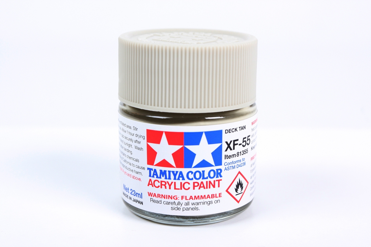 Pintura Acrilica XF55 Deck-Tan Tamiya, Hechas A Base De Resinas Solubles Al Agua, Son Excelentes Para Aplicarse Con Pincel O Aerografo! estas pinturas estan especialmente Diseñadas Para Modelismo!, Las Pinturas Pueden Ser Usadas En Resinas De Estirenos, Unicel, Madera, Metal, Ceramica Y En Modelos De Plasticos Comunes. la Pintura Cubre Bien, Se Aplica Fluidamente, y se puede difuminar facilmente.