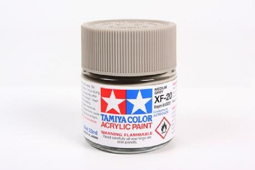 Pintura Acrilica XF20 Medium Grey 23ml By Tamiya  Tamiya, Hechas A Base De Resinas Solubles Al Agua, Son Excelentes Para Aplicarse Con Pincel O Aerografo! estas pinturas estan especialmente Diseñadas Para Modelismo!, Las Pinturas Pueden Ser Usadas En Resinas De Estirenos, Unicel, Madera, Metal, Ceramica Y En Modelos De Plasticos Comunes. la Pintura Cubre Bien, Se Aplica Fluidamente, y se puede difuminar facilmente.